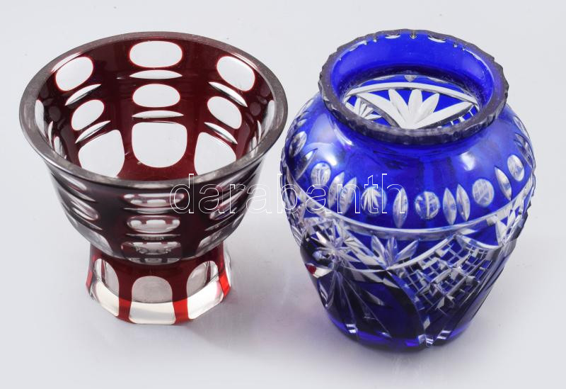 Leírás: 2 darab kéken és bordón pácolt váza, jelzés nélkül, kis kopással, m: 11 cm alatt