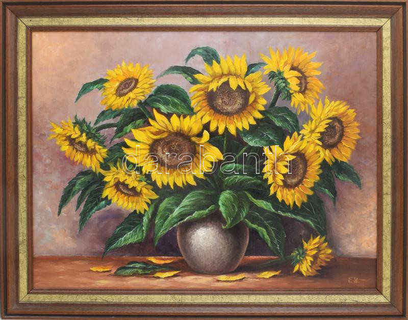 Leírás: F. H. jelzéssel: Napraforgók. Olaj, vászon, jelzett, dekoratív fa keretben. 60x80 cm