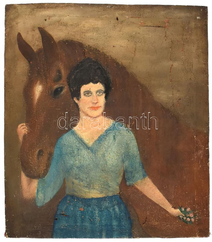 Leírás: Jelzés nélkül: Hölgy lóval. Olaj, vászon, sérült. 55×48 cm