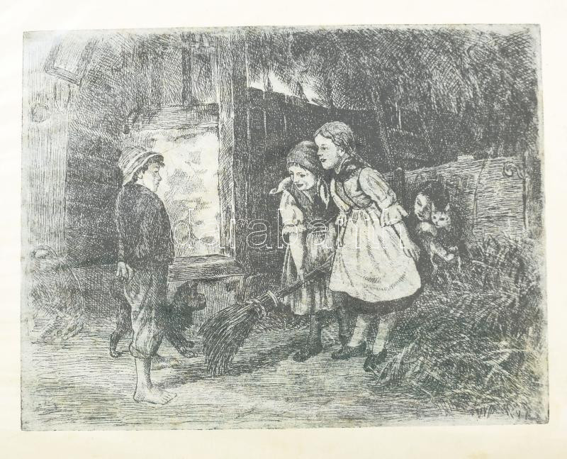 Leírás: Jelzés nélkül: Játszó gyerekek kutyával és macskával. Rézkarc, papír, 18×23 cm