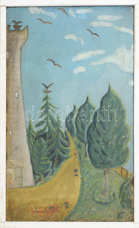 Leírás: Jelzés nélkül, magyar festő, XX. sz.: Fantázia táj. OIaj, vászon. Proveniencia: Saphier-gyűjtemény. Fakeretben. 65×38,5 cm
