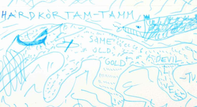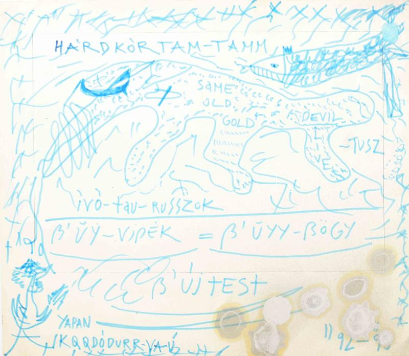 Leírás: Bada Dada (Bada Tibor, 1963-2006): Hárdkór tam-tamm (cím nélkül), 1992-93. Vegyes technika, papír. Jelzés nélkül. 27x31 cm.