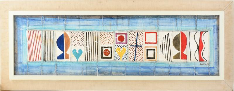 Bartl József (1932-2013): Jelek és fejek. Akril, farost, jelezve jobbra lent: Bartl 89. Hátoldalán autográf felirattal: Bartl 89, Jelek és fejek. Fakeretben. 30x100 cm. KIZÁRÓLAG SZEMÉLYES ÁTVÉTEL, NEM POSTÁZZUK!/ acrylic on fibre board, signed lower right, with autograph description on the reverse, framed. 30x100 cm ONLY PERSONAL COLLECTION AT OUR OFFICE