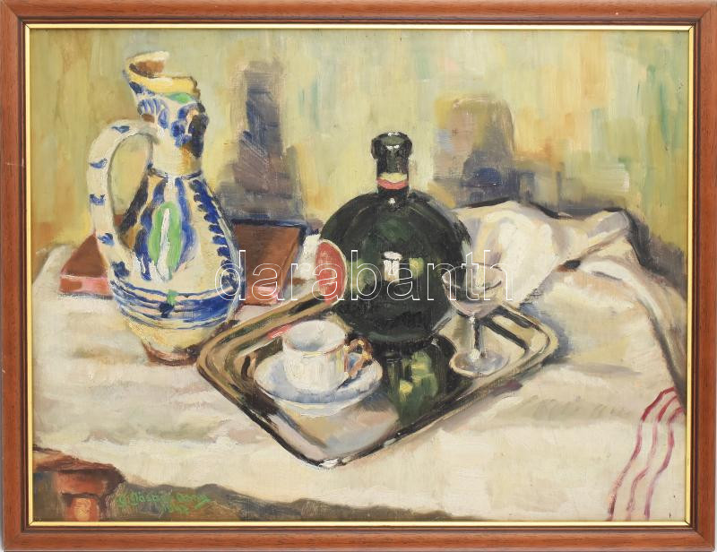 Leírás: Felekiné Gáspár Anni (1902-1992): Csendélet Unicum üveggel, 1947. Olaj, falemez, jelezve balra lent. 45x60 cm Fakeretben. / oil on wood , signed lower left, framed.