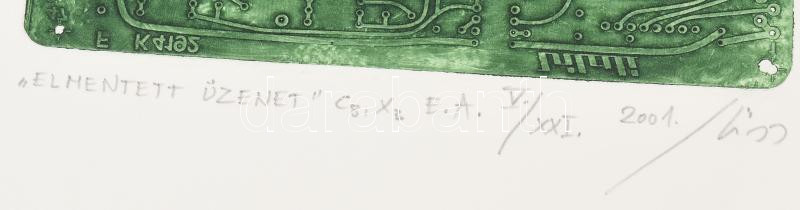 Leírás: Kiss Ilona (1955-): "Elmentett üzenet", 2001. Linómetszet, magasnyomó formáról készült mélynyomás, papír, jelzett. Művészpéldány E.A. V./XXI. számozással. 35x18,5 cm