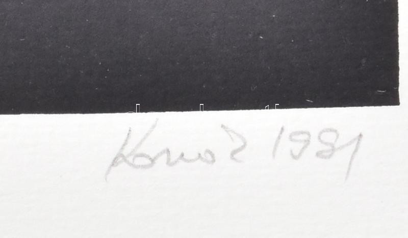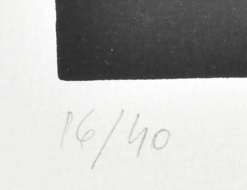 Leírás: Konok Tamás (1930-2020): Kompozíció, 1991. Szitanyomat, papír, jelzett. Számozott 16/40. 28×28 cm