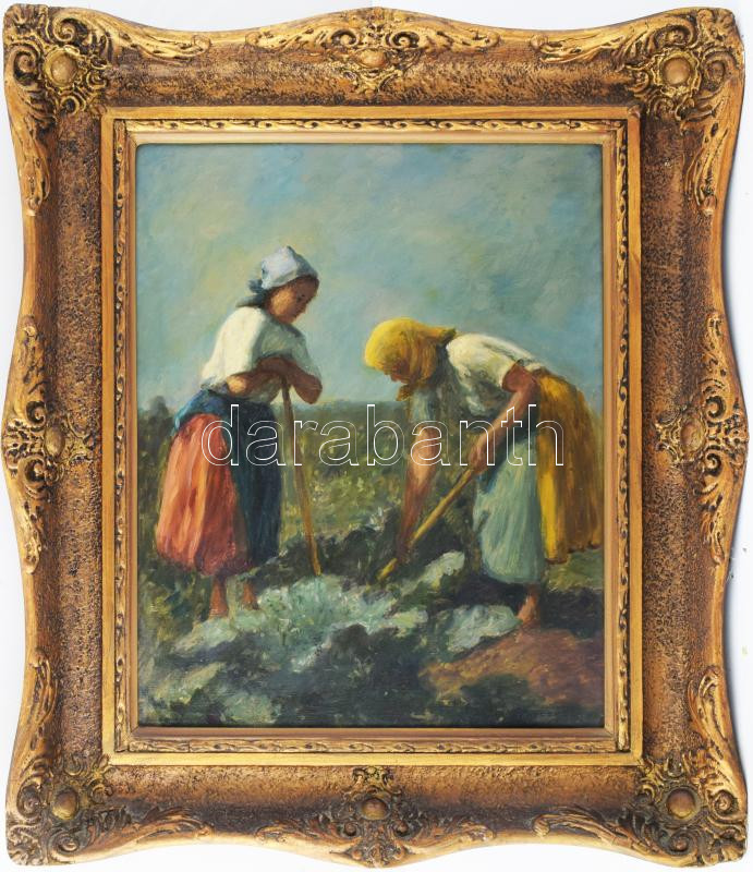 Leírás: Korcsek János (1871-1962) : Ültető asszonyok. Olaj, vászon, jelzett, dekoratív fa keretben 50x45 cm