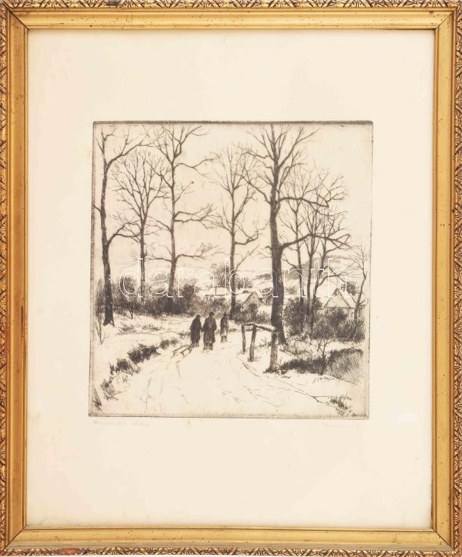 Leírás: Kovács József (?-?): havazás után. Rézkarc, papír, jelzett, üvegezett fakeretben, 22×20,5 cm