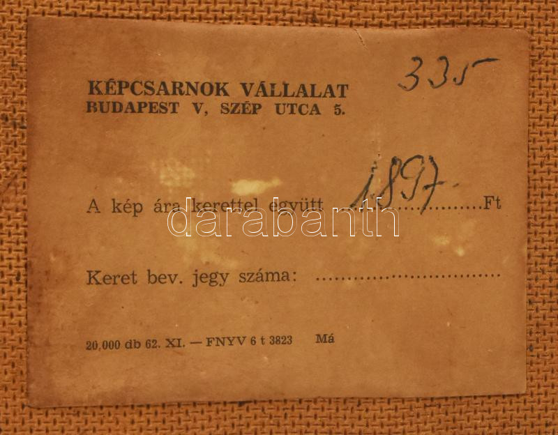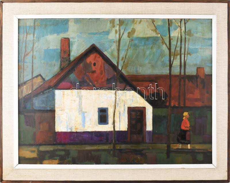 Leírás: Moldován István (1911-2000): Utcarészlet sétálóval (táj). Olaj, farost, jelezve balra lent, hátoldalán Képcsarnok Vállalat címkéjével. Fakerteben. 60×80 cm