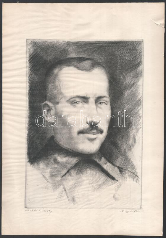 Nagy Zoltán (1916-1987): Ligeti Károly (1890-1919) katona, költő, forradalmár portréja. Rézkarc, papír, jelzett, lapszéli sérüléssel, a lap kissé hullámos, 28,5x20 cm