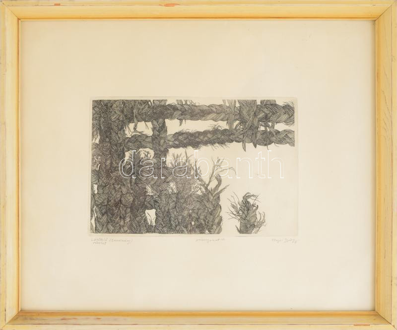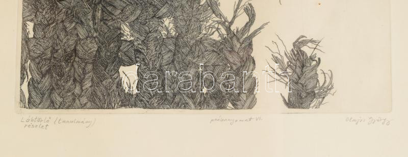 Leírás: Olajos György (1953-): Lálbtörlő, Tanulmány. Rézkarc, papír. jelzett, sorszámozott próbanyomat VI. Üvegezett keretben 15x22 cm