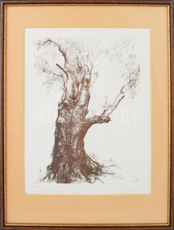 Leírás: Olexa József (1960-): Öreg bükk. Rézkarc, papír jelzett, 39x29 cm, üvegezett fakeretben.