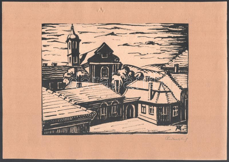 Leírás: Peukert Károly (1903-1973): Városrészlet. Tus, papír, jelzett. Paszpartuban. 17x22 cm