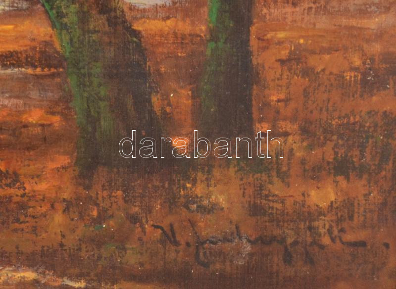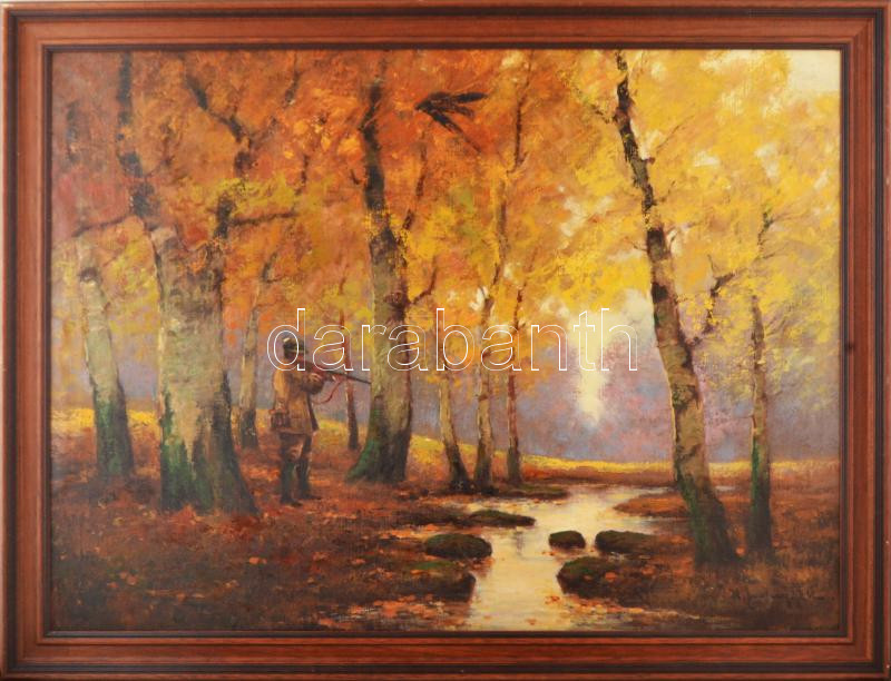 Sashegyi Kálmán, Vodicai (1886-1940): Vadász puskával. Olaj, vászon, jelzett. Javított. Fakeretben, 72×98 cm. KIZÁRÓLAG SZEMÉLYES ÁTVÉTEL, NEM POSTÁZZUK! / ONLY PERSONAL COLLECTION IN OUR OFFICE!