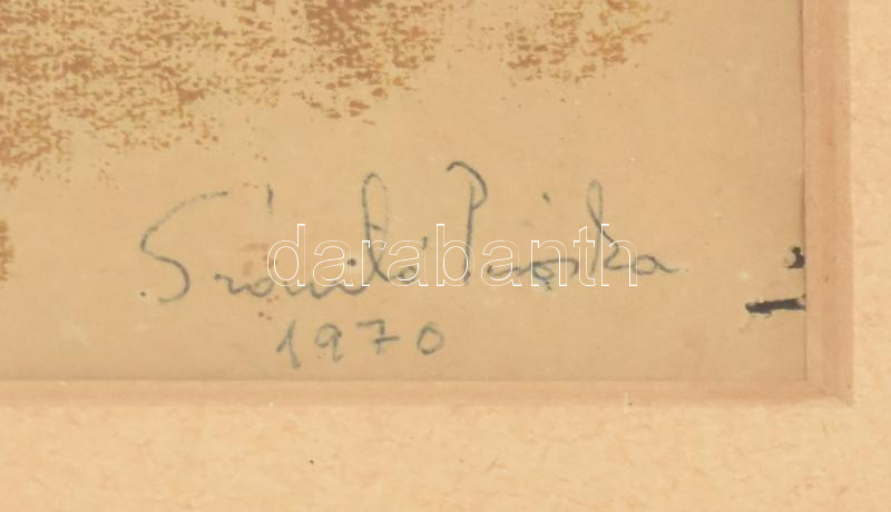 Leírás: Szántó Piroska (1913-1998): Régi szerb temetői korpusz. Monotípia, papír, jelzett. Üvegezett fakeretben. A lapon kis gyűrődés nyommal. 35x25 cm