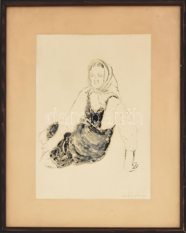 Leírás: Szántó Piroska (1913-1998): TÁmaszkodó asszony. Lavírozott tus, papír, jelzett. Üvegezett fakeretben. A lapon kis gyűrődés nyommal 28x20 cm