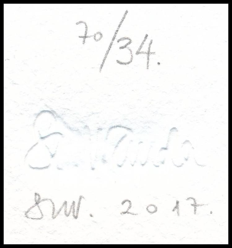Leírás: Szyksznian Wanda (1948-): Motívumok (cím nélkül, a Gyöngykor c. mappából). Computer print, merített papír, jelzett, számozott (34/70), 28x13 cm
