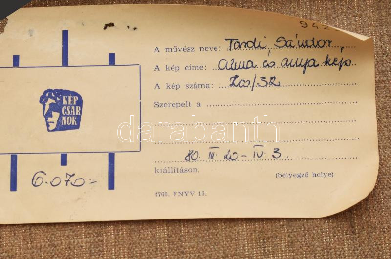 Tardi Kovács Sándor (1938-2013): Alma és anya kép, 1979. Olaj, vászon, jelezve középen balra, hátoldalán autográf felirattal és Képcsarnok Vállalat címkéjével. Fakeretben. 60,5×80,5 cm