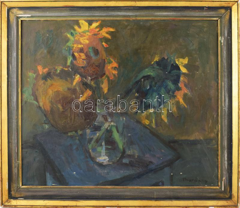 Thuróczy Zoltán (1935-): Napraforgók. Olaj, vászon, jelezve jobbra lent. Hátoldalán autográf felirattal valamint Képcsarnok Vállalat kissl töredékes címkéjével. Apró sérüléssel 60x70 cm. Dekoratív, kissé sérült fakeretben.