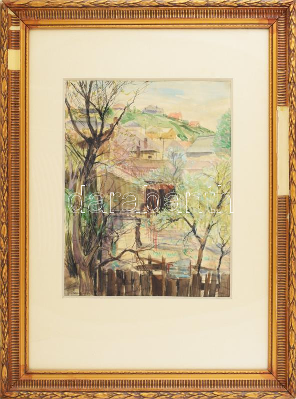 Leírás: Udvary Pál (1900-1987): Budafoki részlet, 1940. Akvarell, pasztell, papír, jelezve balra lent. Dekoratív, üvegezett, sérült fakeretben, 44×34 cm