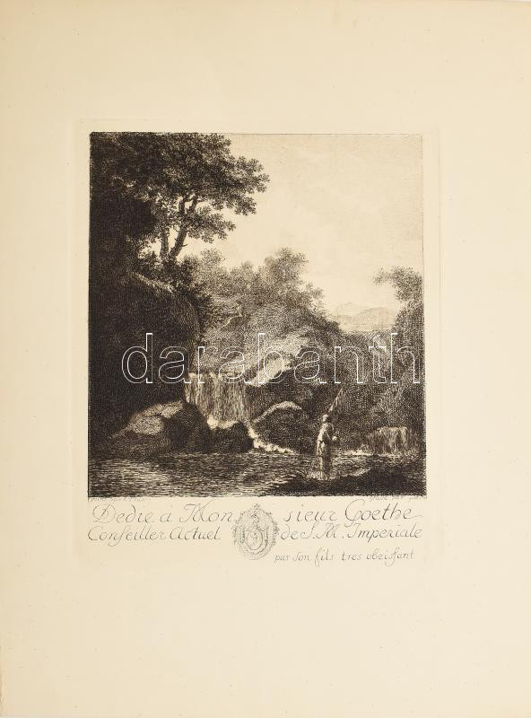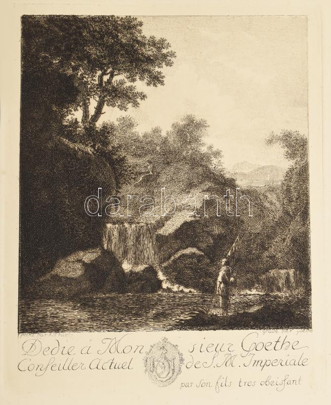 Johann Wolfgang von Goethe (1749-1832) metszése, Johann Alexander Thiele (1685-1752) festménye után: Romantikus táj vízeséssel. Heliogravür, rézkarc, papír, jelzett a karcon. 14x12,5 cm / Johann Wolfgang von Goethe (1749-1832), nach dem Gemälde von Johann Alexander Thiele (1685-1752): Landschaft mit Wasserfall. Radierung auf Papier, signiert im Stock: peint par A. Thiele, gravé par Goethe. 14x12,5 cm.