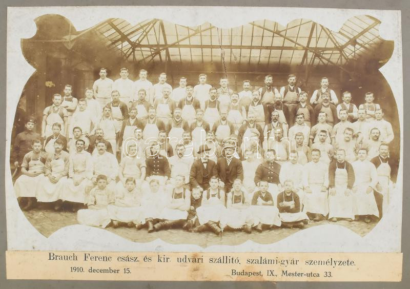 1910 Bp., Brauch Ferenc cs. és kir. udvari szállító szalámigyár személ... https://www.darabanth.com/hu/469-Gyorsarveres/469.0/Fotomuveszet/Foto~500023/1910-Bp-Brauch-Ferenc-cs-es-kir-udvari-szallito-szalamigyar-szemelyzete-kartonra-kasiro~II3143824