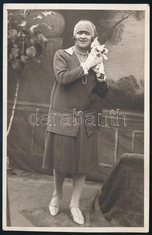 Leírás: 1927 Nagymaros, hölgy kiskutyával, fotólap, a hátoldalon dedikációval, 13,5x8,5 cm