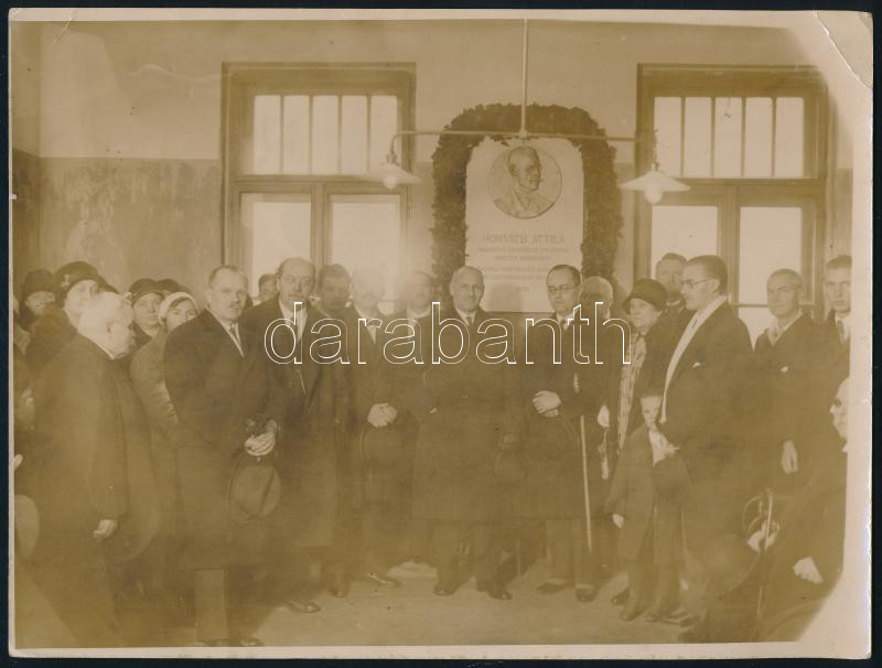 1931 Horváth Attila (1862-1921) vak zeneszerző, zongoraművész emléktáblájának felavatása a Vakok Intézetének épületében (Bp., Hermina út 21.), nagyméretű fotó, a hátoldalon pecséttel jelzett (Fotoriport Gárdonyi Testvérek), saroktöréssel, 24x18 cm