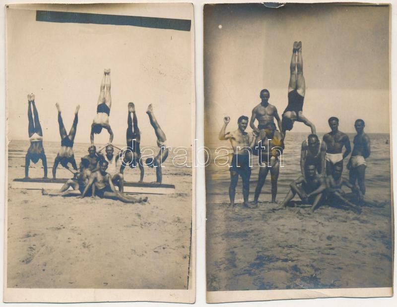Leírás: Tornázó férfiak vízparton, 2 db fotó, egyik felületén törésnyom, 13×8 cm