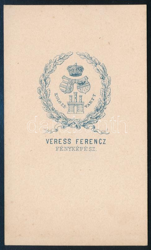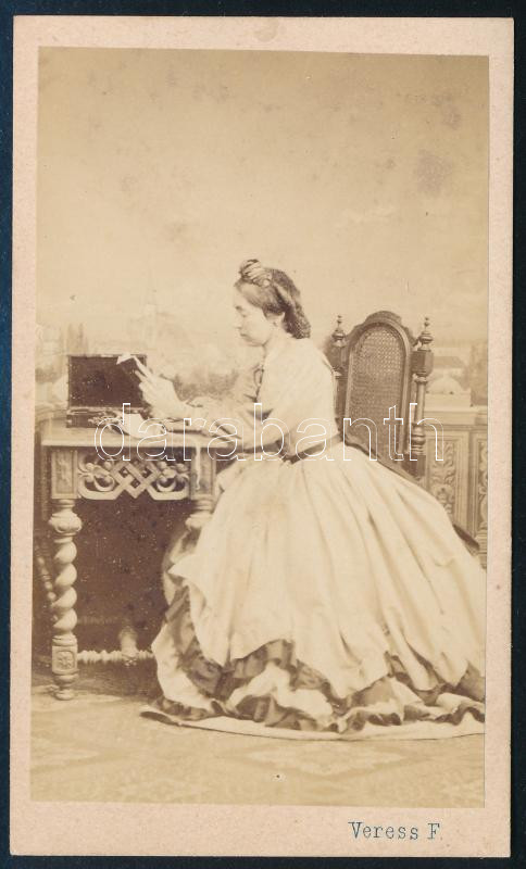 cca 1855-60 Fiatal, előkelő, könyvet olvasó hölgy portréja, keményhátú fotó Veress Ferenc kolozsvári műterméből, érdekes magyar-erdélyi címeres hátlappal, korai erdélyi cdv, 10,5x6 cm