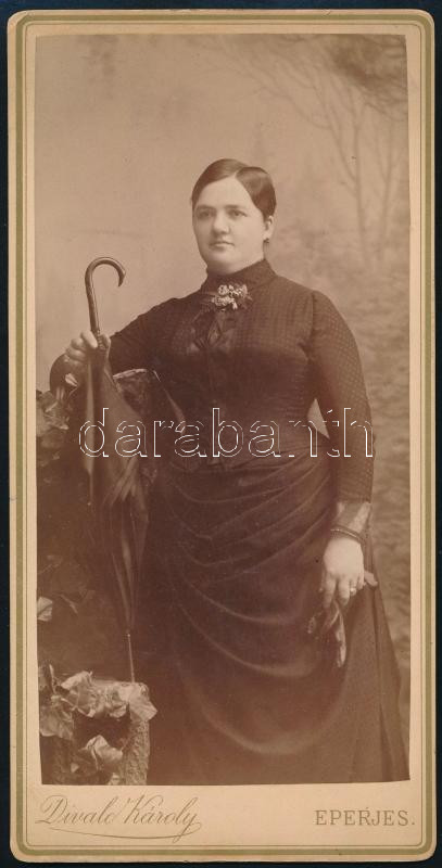 Leírás: cca 1885 Női portré, keményhátú fotó Divald Károly eperjesi műterméből, 21×10,5 cm