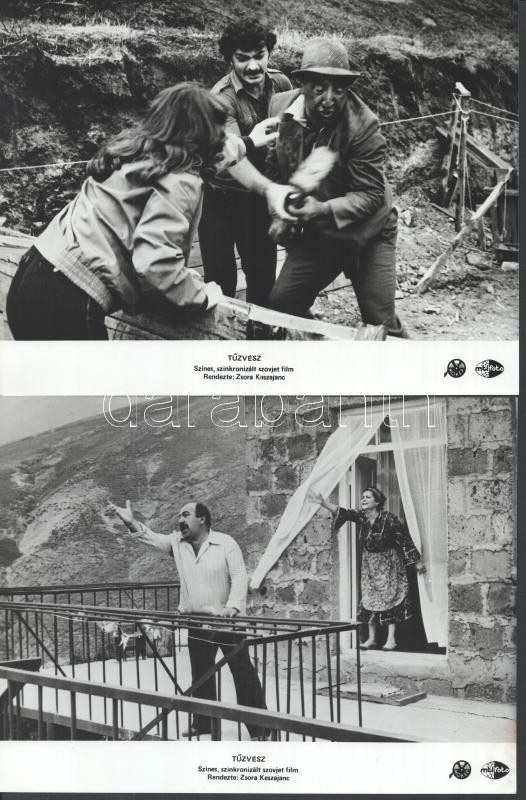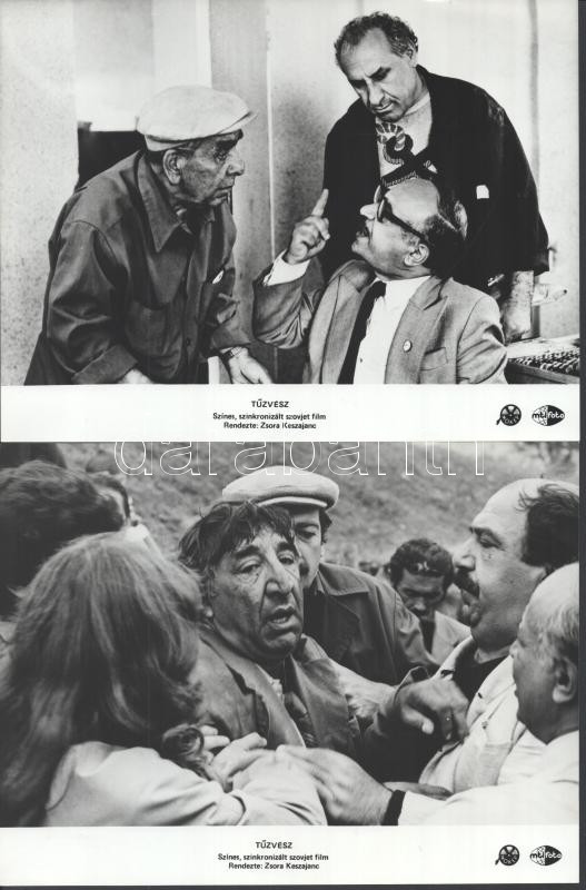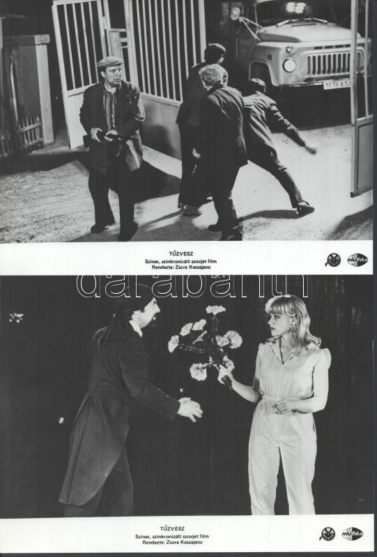 cca 1989 előtt készült ,,Tűzvész" című szovjet film jelenetei és szereplői, 6 db vintage produkciós filmfotó (vitrinfotó, lobbyfotó) ezüst zselatinos fotópapíron, a használatból eredő (esetleges) kisebb hibákkal, több képen barna elszíneződés, 18x24 cm