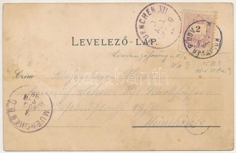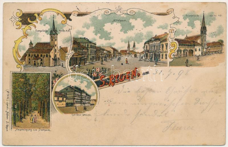 1898 (Vorläufer) Szászrégen, Reghin; Evangelische Kirche, Mittelgasse, Gymnasial Gebäude, Haupteingang zum Stadtpark / Evangélikus templom, gimnázium, utca, park főbejárata. Ignatz Hübner No. 1442. / church, school, park entry, street. Art Nouveau, floral, litho (fl)