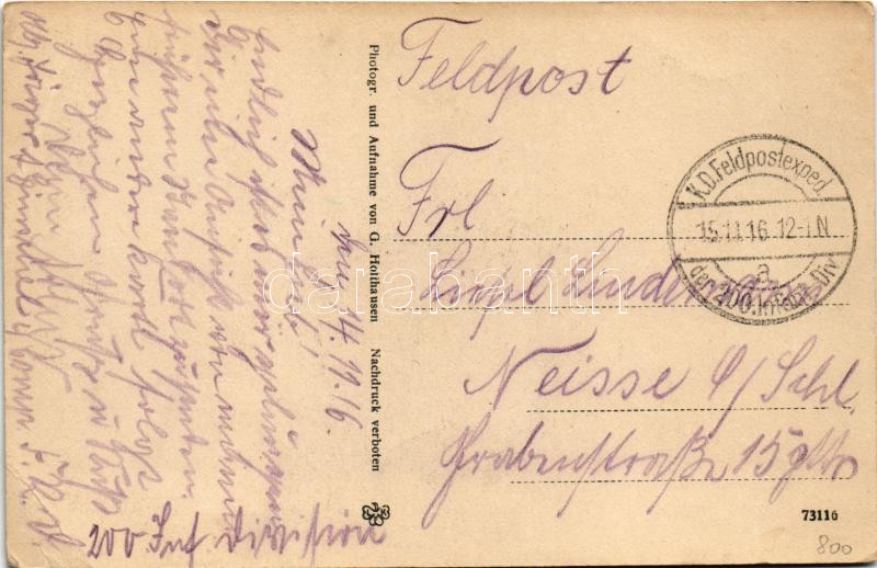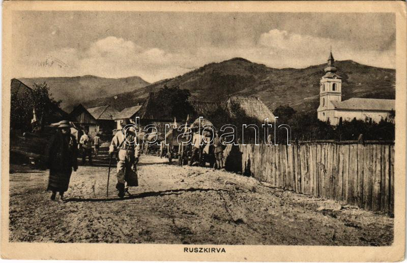 1916 Oroszkő, Ruszkirva, Repedea (Máramaros); utcakép, templom, Vöröskeresztes katonák trénje / street view with church, Red Cross military transport (EB)