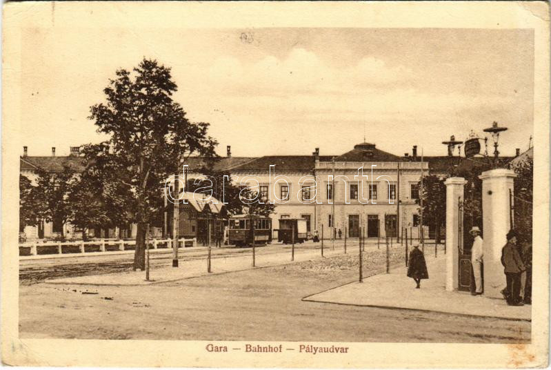 1924 Nagyszeben, Hermannstadt, Sibiu; Gara / Bahnhof / Pályaudvar, vasútállomás, villamos a megállóban. Jos. Drotleff Nr. 21. / railway station, tram stop (EK)
