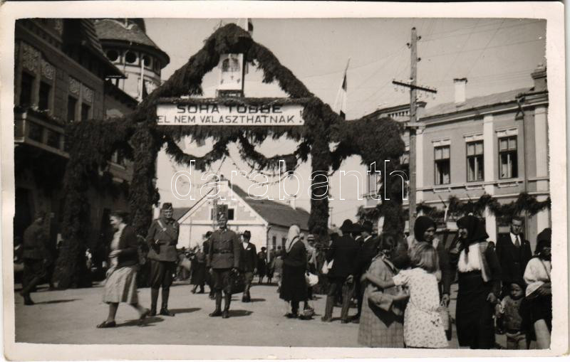 1940 Gyergyószentmiklós, Gheorgheni; Fő tér bevonuláskor, "Soha többé el nem választhatnak!" feliratos díszkapu / entry of the Hungarian troops, main square, Hungarian irredenta propaganda, decorated gate. photo
