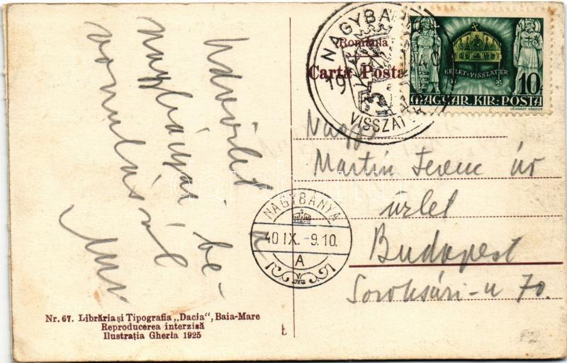 Leírás: 1940 Nagybánya, Baia Mare; Strada Valea-rosie / Veresvízi utca / street (felszíni ragasztás / surface gluemark) + "1940 Nagybánya visszatért" So. Stpl