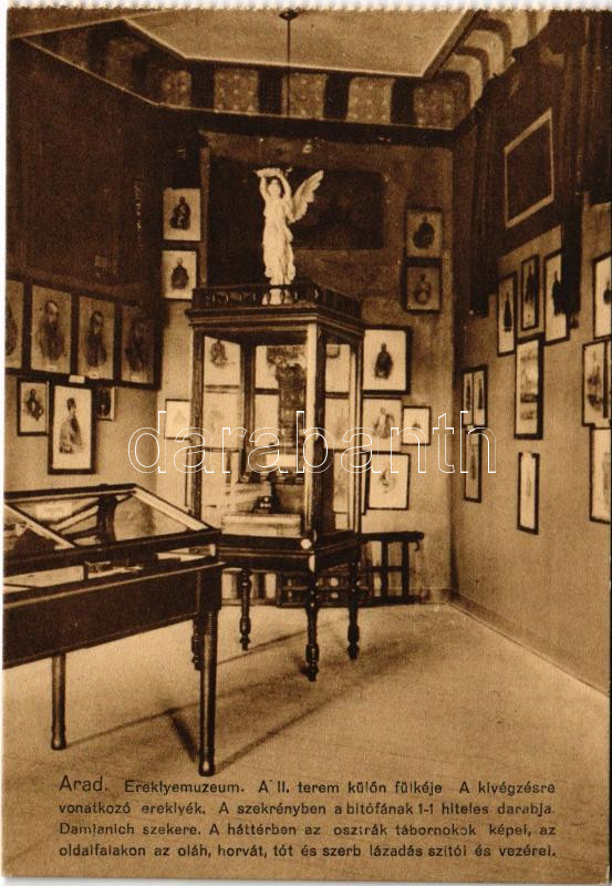 Arad, Ereklyemúzeum. A II. terem külön fülkéje. A kivégzésre vonatkozó erekylék. A szekrényben a bitófának 1-1 hiteles darabja. Damjanich szekere. A háttérben az osztrák tábornokok képei, az oldalfalakon az oláh, horvát, tót és szerb lázadás szítói és vezérei. Kerpel Izsó kiadása / relic museum of the Hungarian Revolution of 1848 - képeslapfüzeből / from postcard booklet