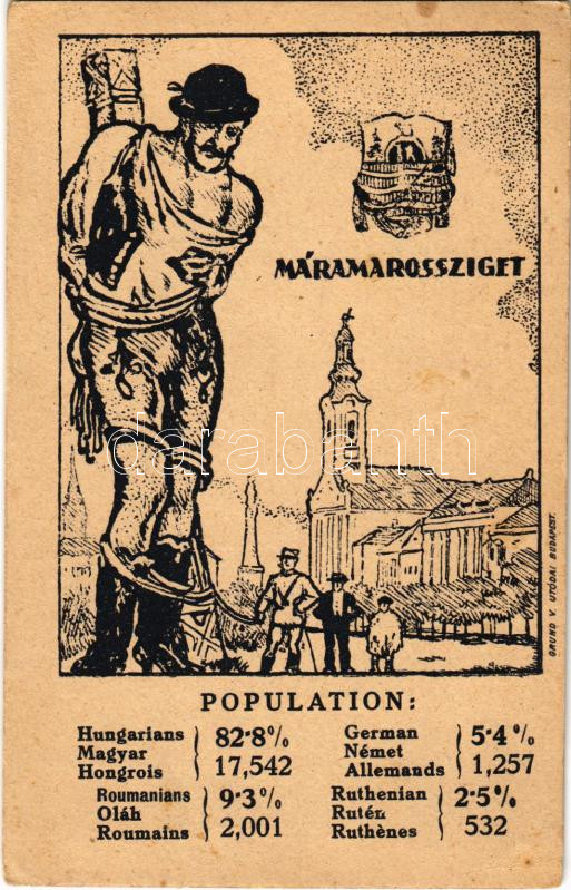 Máramarossziget, Sighetu Marmatiei; Magyar, német, román (oláh) és rutén nemzetiségek népesség aránya. Címer, Grund V. Utódai, Magyar Nemzeti Szövetség kiadása / Percentage of Hungarian, German, Romanian and Ruthenian (Rusyn) population. Irredenta art postcad with coat of arms s: Pólya Tibor (fl)