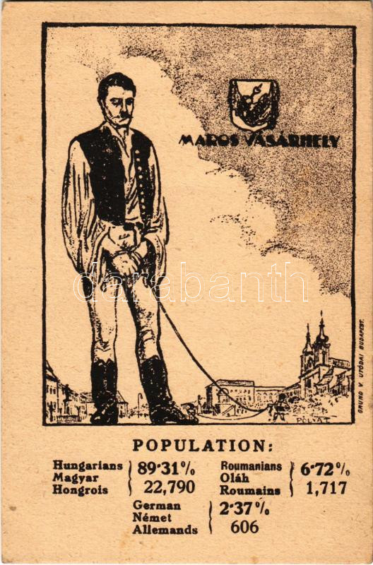 Marosvásárhely, Targu Mures; Magyar, német és román (oláh) nemzetiségek népesség aránya. Címer, Grund V. Utódai, Magyar Nemzeti Szövetség kiadása / Percentage of Hungarian, German and Romanian population. Irredenta art postcad with coat of arms s: Pólya Tibor (fl)