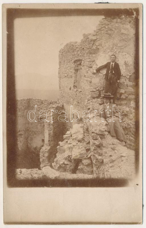 Leírás: 1906 Hrussó, Rusó, Hrusov; vár kirándulókkal / castle ruins / Hrusovsky hrad. photo (ragasztónyomok / gluemarks)
