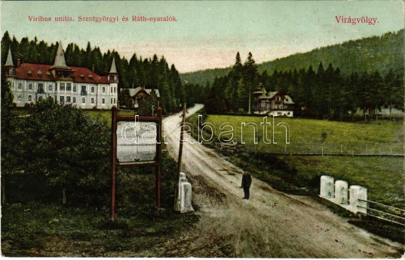 Leírás: 1911 Tátra, Tatry; Virágvölgy (Rózsavölgy), Blumental, Kvetnica; Viribus Unitis, Szentgyörgyi és Ráth nyaralók. Divald Károly műintézete 2147-1909. / villas