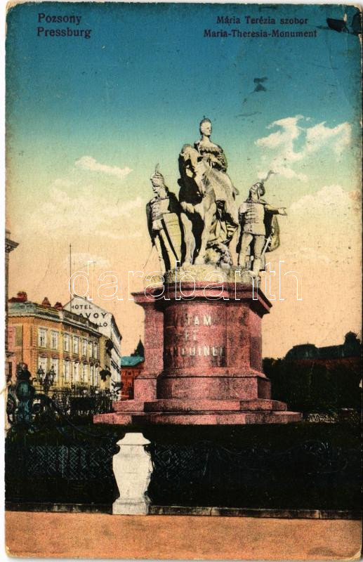 1914 Pozsony, Pressburg, Bratislava; Mária Terézia szobor, Hotel Savoy... https://www.darabanth.com/hu/469-Gyorsarveres/469.0/Kepeslapok/Felvidek~1500006/1914-Pozsony-Pressburg-Bratislava-Maria-Terezia-szobor-Hotel-Savoy-szalloda-Maria-Theresia-~II3175706