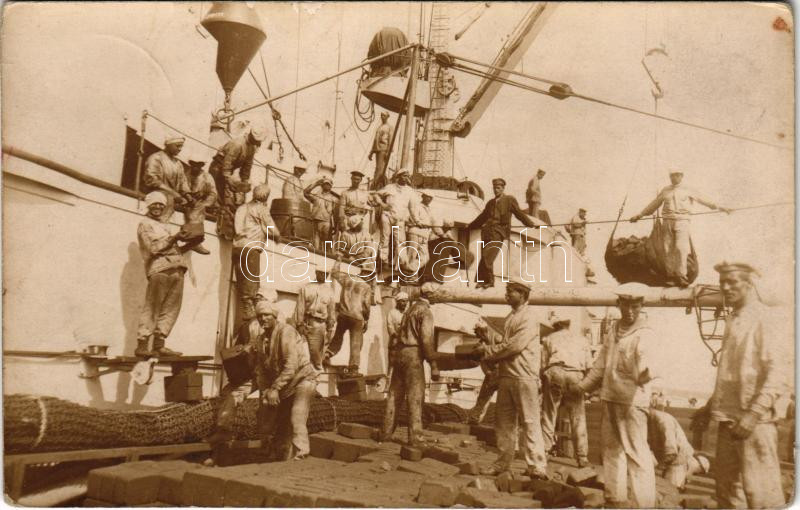 Leírás: 1916 SMS ZRÍNYI az Osztrák-Magyar Haditengerészet Radetzky-osztályú pre-dreadnought csatahajó matrózai szénrakodás közben / K.u.K. Kriegsmarine / SMS Zrínyi Austro-Hungarian Navy Radetzky-class pre-dreadnought battleship, mariners loading coal. photo + "K.u.k. Marinefeldpostamt"