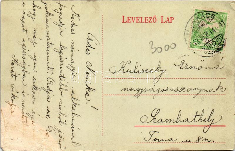 Leírás: 1913 Munkács, Mukacheve, Mukacevo; Városi színház, Iczkovics József üzlete, órás és éskzerész / theatre, shops (ázott / wet damage)