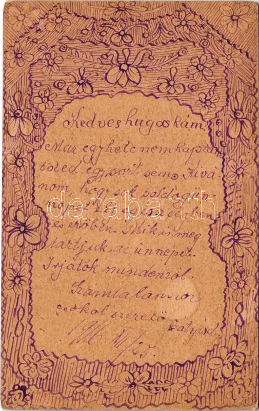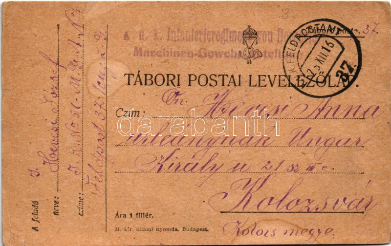 1916 Hevesi József saját rajza húgának Kolozsvárra. Első világháborús tábori postai levelezőlap / WWI K.u.k. military field post, hand-drawn greeting to Cluj + "K.u.k. Infanterieregiment von Bar. No. 52. Maschinen-Gewehr-Abteilung No. 4." (EK)