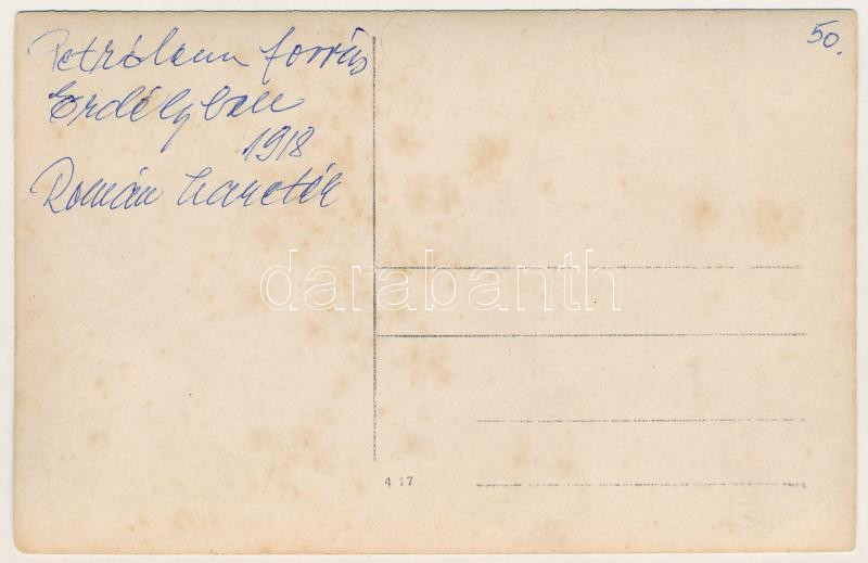 1918 Román harctér, petróleum forrás / WWI K.u.K. military, Romanian f... https://www.darabanth.com/hu/469-Gyorsarveres/469.0/Kepeslapok/Katonai~1500033/1918-Roman-harcter-petroleum-forras-WWI-KuK-military-Romanian-front-petroleum-source-ph~II3131897