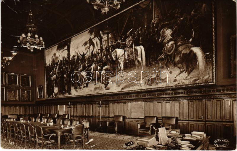 Budapest V. Országház, Parlament, belső, a képviselőház elnöki fogadója, háttérben Munkácsy Mihály "Honfoglalás" festménye. Csiky Foto (felszíni sérülés / surface damage)