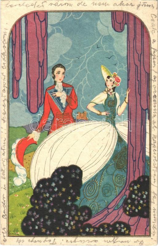 Leírás: 1928 Romantic couple, lady art postcard. Degami 1047. s: Leonem