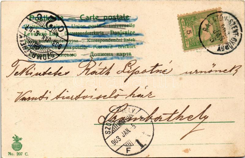 Leírás: 1903 Boldog új évet! Szecessziós hölgy malacokkal / New Year greeting, lady with pigs. Trademark No. 207. C. Art Nouveau litho
